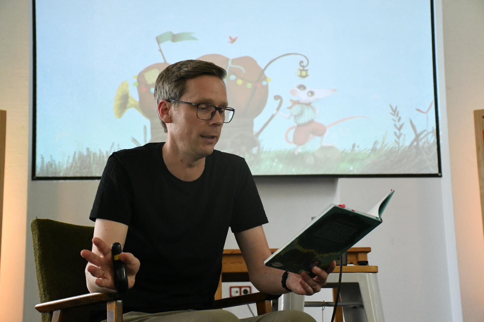 Spannend war auch der Blick hinter die Kulissen: Per Projektion zeigte Gerhard Zeichnungen und Entstehungsvideos der Illustratorin Mareike Ammersken, die mit ihrem feinen Strich und verspielten Details den „Wahrlichwald“ visuell zum Leben erweckt hat. Gerhard, selbst mit künstlerischem Hintergrund, berichtete von der engen und zugleich freien Zusammenarbeit zwischen Autor und Illustratorin: Mareike Ammersken zeichnete auf Grundlage des fertigen Textes, Sven Gerhardt sah die Bilder – und spürte sofort, dass sie passten. So konnte sich die Geschichte weiterentwickeln, in einem kreativen Miteinander von Wort und Bild.