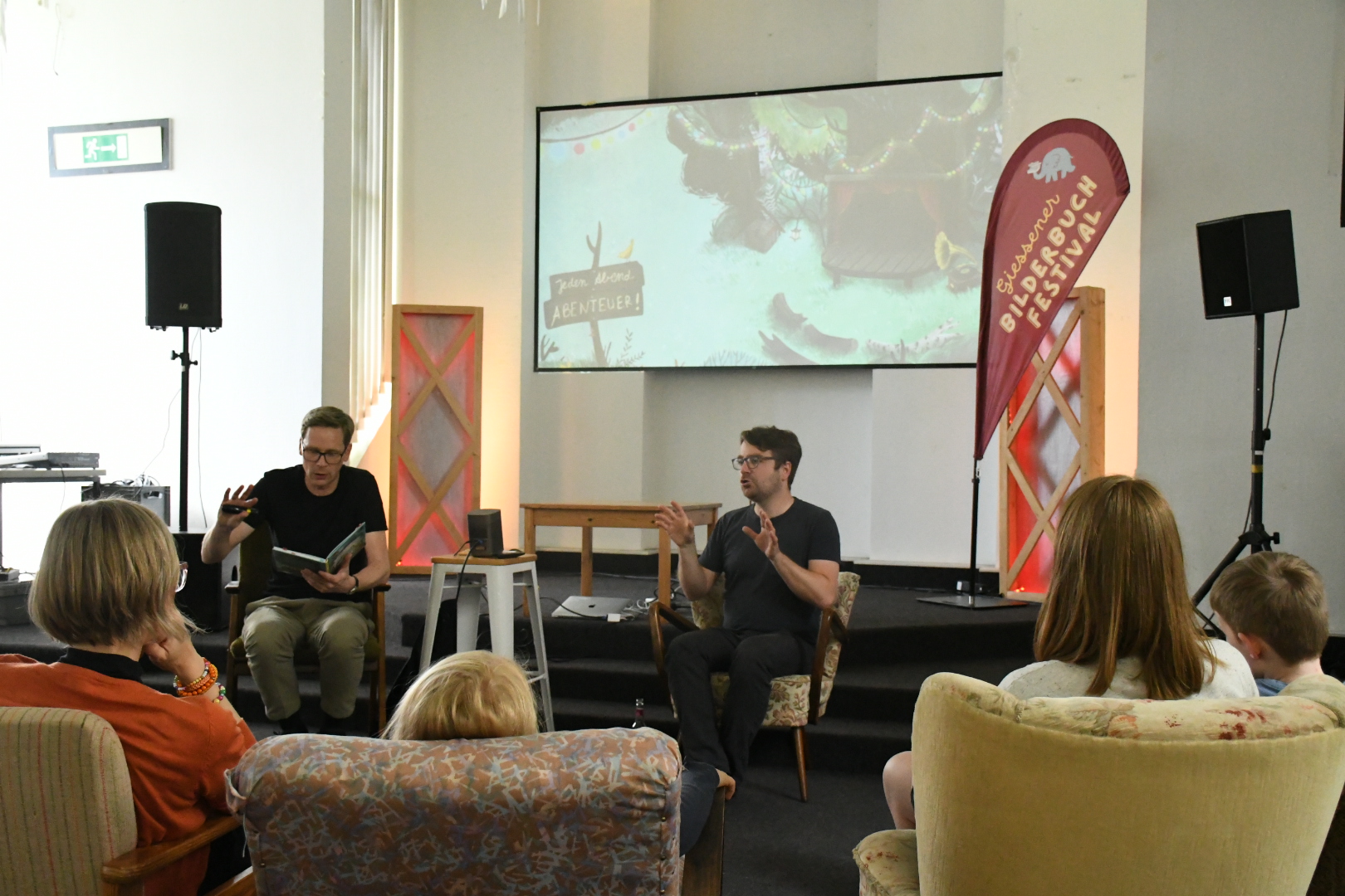 Sven Gerhardt wurde 1977 in Marburg geboren und ist seit 2003 Kinderbuchautor. Er hat mit Reihen wie „Die Heuhaufen-Halunken“ oder „Mister Marple“ einen Namen im Kinderbuchbereich gemacht. Seine Bücher erscheinen im Arena Verlag und zeichnen sich durch Humor, Herz und liebevoll gezeichnete Figuren aus. Auch „Minna Melone – Wundersame Geschichten aus dem Wahrlichwald“ steht in dieser Tradition: fantasievoll, nah an der Lebenswelt von Kindern – und mit einem Augenzwinkern erzählt. Begleitet wird Gerhardt von Daniel Schneider, der die Geschichte in Gebärdensprache übersetzte. Seine Präsenz verlieh dem Nachmittag eine zusätzliche erzählerische Ebene. Besonders viel Freude hatten die Kinder daran, die Gebärden für den Satz „Jeden Abend ein Abenteuer“ selbst zu lernen und mitzumachen.